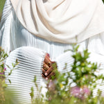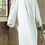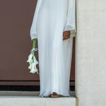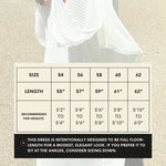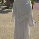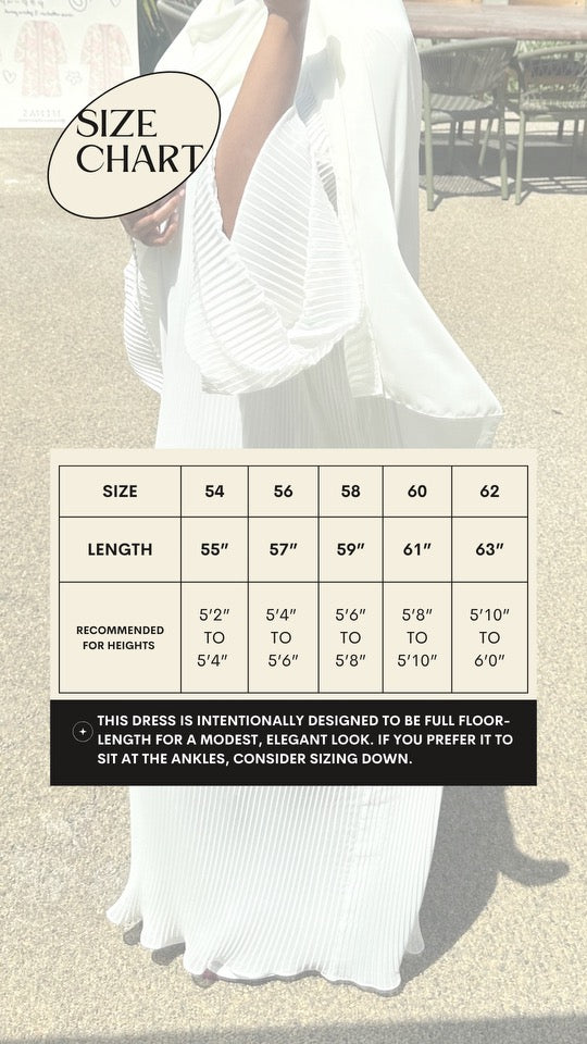 A pleated white maxi dress designed for full floor-length coverage and a modest, flowing silhouette. Made from lightweight chiffon and fully lined throughout for complete coverage and ease of wear. Finished with wide frayed sleeves and a relaxed, effortless fit.